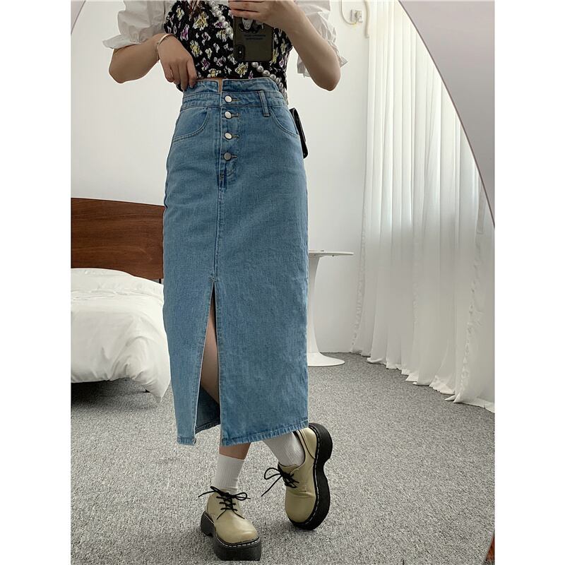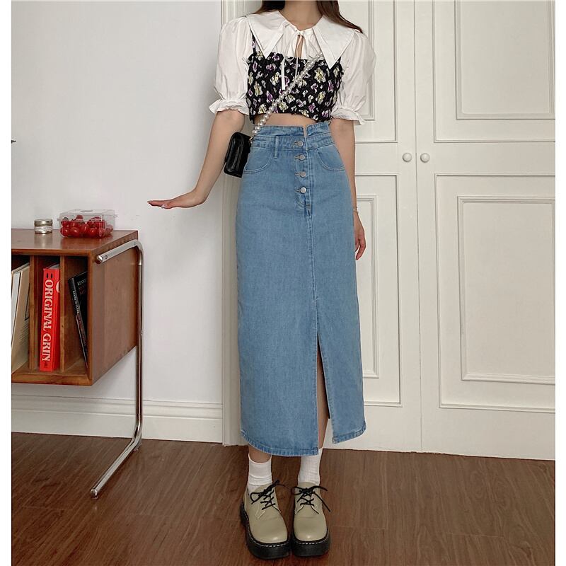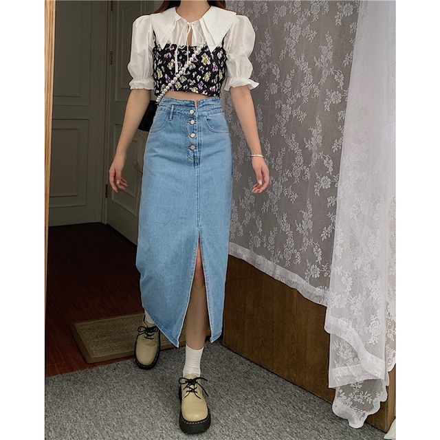 レイヤードネックシャッ+花柄キャミソール+デニムスカート3点セットアップ A0908