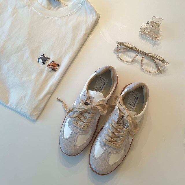 ジャーマントレーナーシューズ ジャーマントレーナー型のスニーカーです♡ ベージュ、グレー、ホワイトの カラーが入っているのでかわいらしくも カジュアルにもはけるスニーカーです。