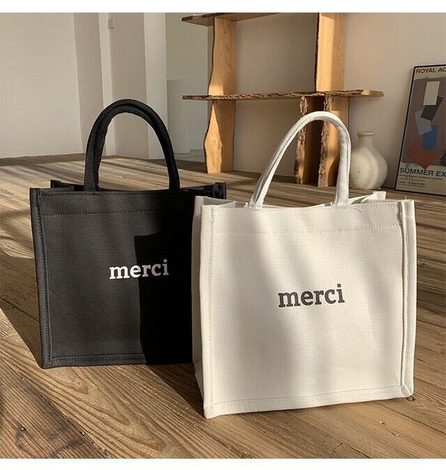 merciキャンパストート 2色展開♡ マチもしっかりある大容量の キャンパストートバッグ シンプルなmerciのロゴのみなので 服装を選ばずに使えます。 学校用や仕事用、荷物が多い方に おすすめです♡ 高さ31.5cm×横34.5cm マチ17cm