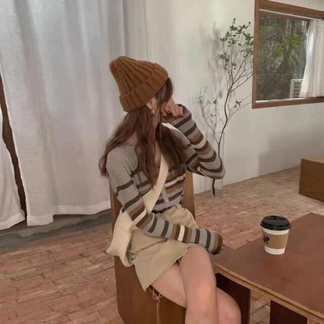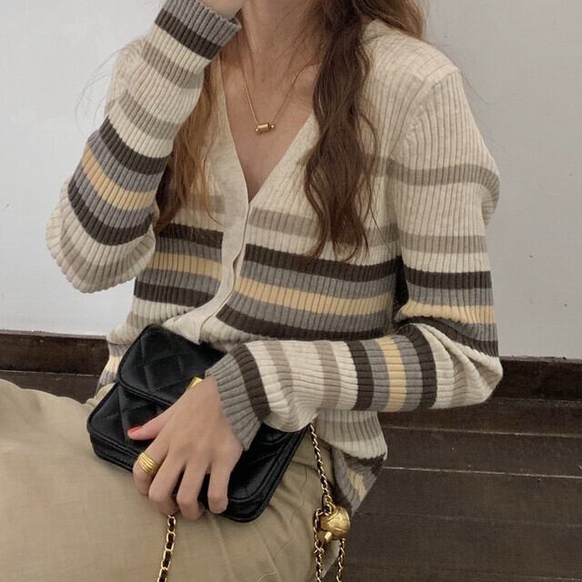 リブボーダートップス 2色展開♡ これから秋冬に使える リブ生地のボーダートップスです。 vネックで顔まわりもすっきり! アクセサリーが映えるデザイン。 あわせるものを選ばないので手持ちの アイテムとコーディネートできちゃいます♡ 着丈57cm バスト94cm