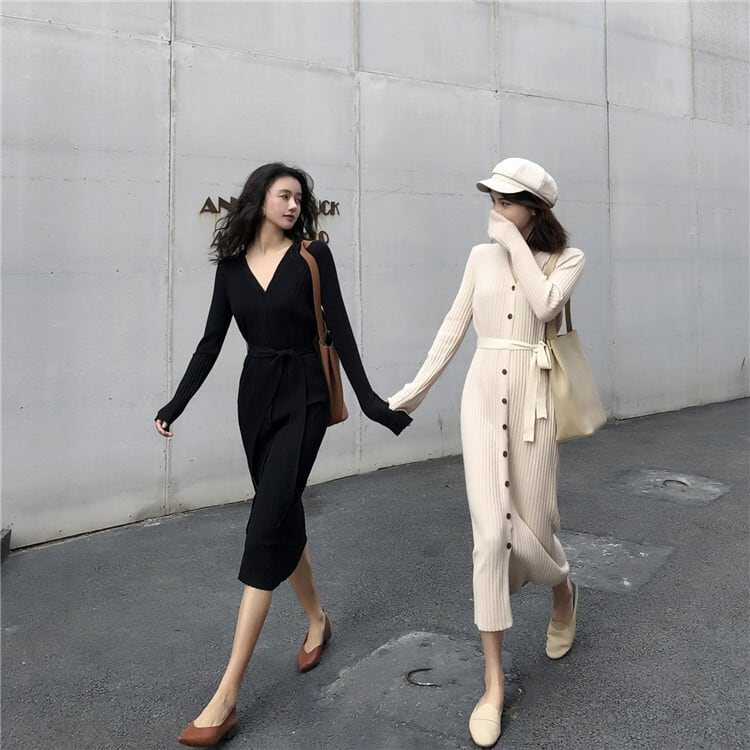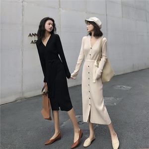 フレンチニットドレス 2色展開♡ 春、夏の終わりの羽織り、秋 と使えるリブ生地のワンピース。 着瘦せに見えます♡ 着丈105㎝ バスト80-114 肩幅34㎝ 袖丈55㎝