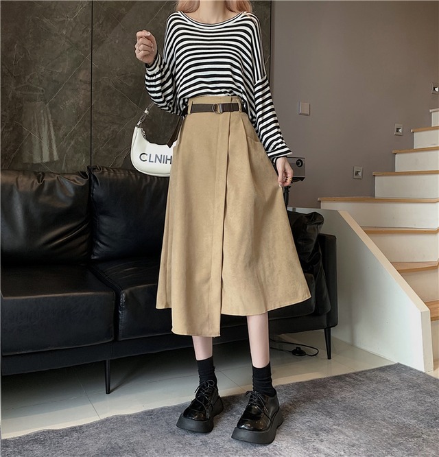 ベルト付きAラインスカート フリーサイズ 着丈:73cm ウエスト:60-82cm 撮影時のライティング、PCやスマートフォンの環境により写真の色味が実際の商品と異なって見える場合がございます。 ご了承の上お買い求めくださいませ。 ------------------------------------------------------