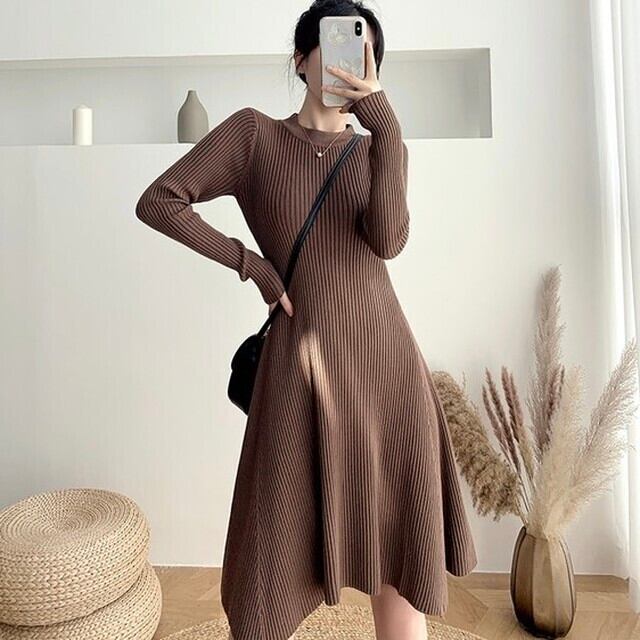 フィット&フレアニットワンピース サイズ S 着丈81㎝ バスト64-84㎝ 肩幅30㎝ 袖丈53㎝ M 着丈82㎝ バスト68-88㎝ 肩幅31㎝ 袖丈54㎝ L 着丈83㎝ バスト72-92㎝ 肩幅32㎝ 袖丈55㎝ フィット&フレアシルエットのミニ丈ニットワンピース。 シンプルで分厚すぎないのでアウターを着ても着膨れしないです。 小物でアクセントをつけても◎ ------------------------------------------------------