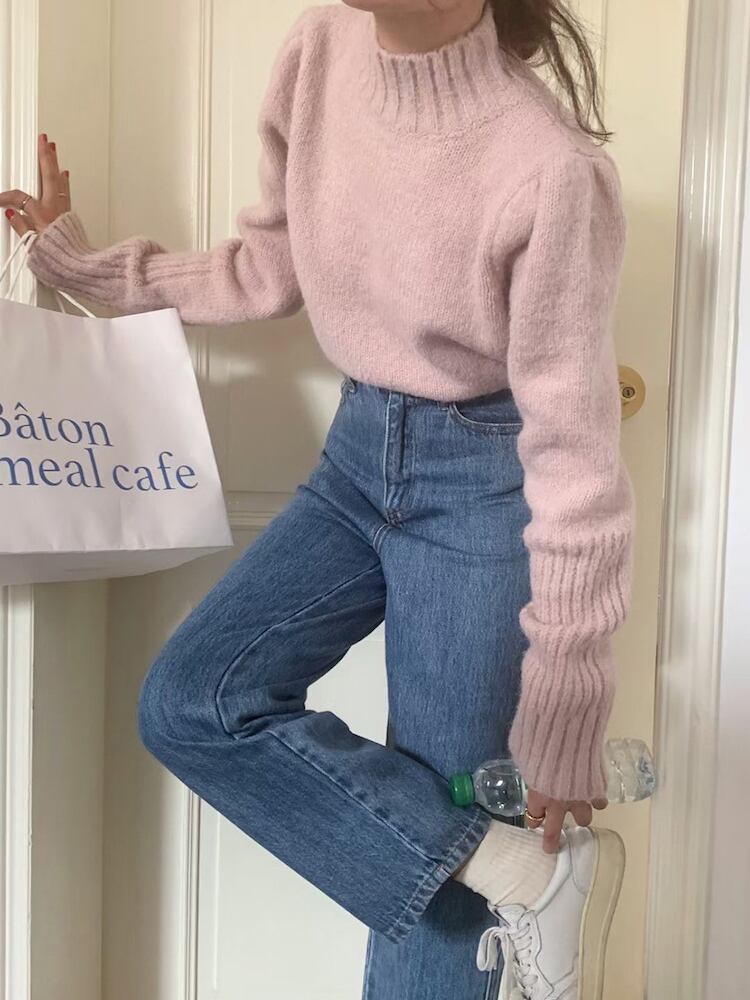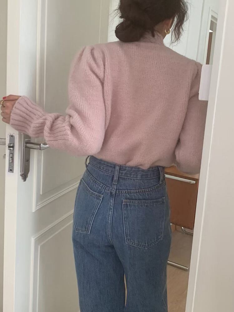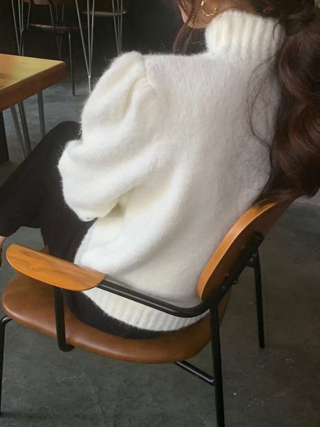 パフスリーブハイネックニット フリーサイズ 着丈52cm 袖丈69cm バスト96cm 三色展開♡ ハイネックにパフショルダーの ニット。 強すぎない肩の膨らみなので着やすく かわいらしく着られます。 パンツスタイルにインして カジュアルダウンさせても◎ ------------------------------------------------------